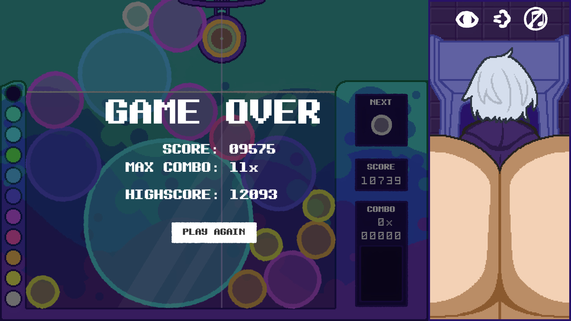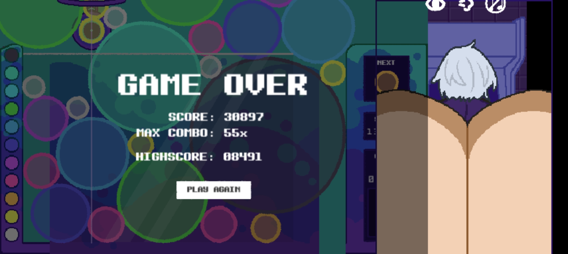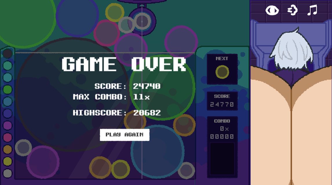 Love this game!! It's really addictive (and hot). I so wish there was an option to slap their butt. Maybe there could be a mechanic tied to it too? Like it'd make them fart while deleting a random bubble in the process? Other than that, REALLY fun!